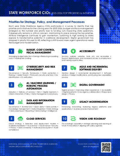 The Technology Committee has released its 2025–2026 priorities, marking a notable shift in focus from digital services to operational resilience. For the upcoming year, Budget, Cost Control, and Fiscal Management rose to the top spot, reflecting the impact of funding cuts on state operations and IT projects. Cybersecurity and Risk Management remain critical concerns, while Artificial Intelligence (AI) continues to gain momentum as states explore its potential in workforce development. Notably, Digital Government, previously a top priority, dropped to #8, signaling a pivot toward foundational improvements like modernization.